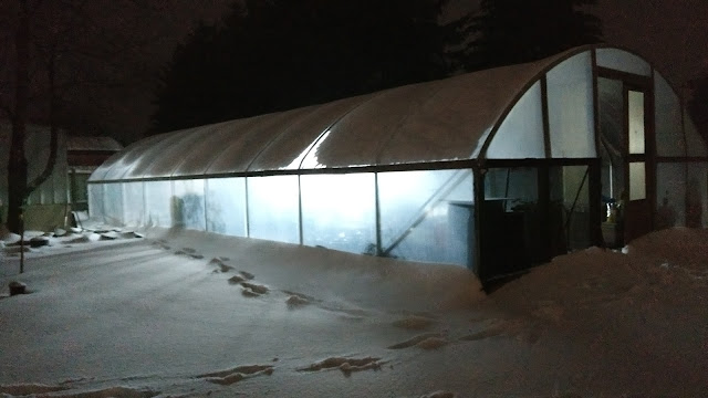 The growing season has officially ended. 24 degrees with 8" of snow on the ground and I'll be heading out to knock it off the greenhouse soon.